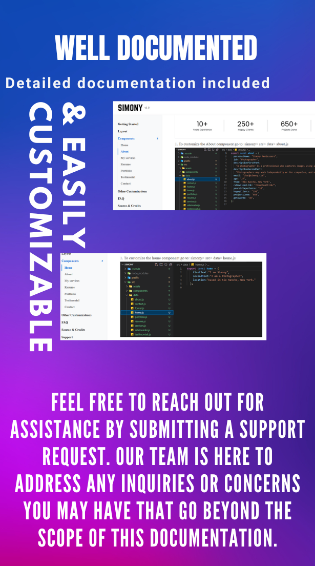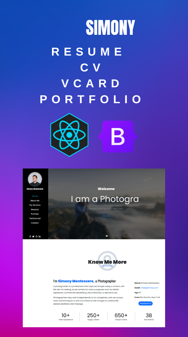 Simony is a one-page React template for resume, cv, vcard and bootstrap 5 personal portfolio website with unique design, made with precision and focus on an intuitive user experience. A design that will suit every use, and give your customers a sense of true quality. The perfect personal portfolio template for beginners and professionals engineer. Designed and developed keeping in mind the latest one page portfolio design standard.